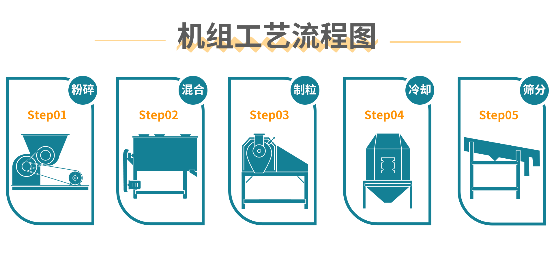 根(gēn)據需求設計了這套顆粒飼料生產線,設(shè)備工作流程包(bāo)括(kuò):粉碎、混合、製粒、冷(lěng)卻、篩分。