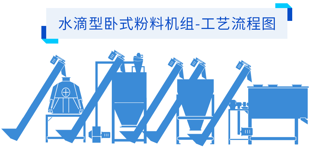 搭配的設備有水滴型粉碎機、配料秤、單軸雙螺旋混合機、提升輸送設備、除塵除鐵設備(bèi)、緩衝倉、電控櫃、配件等。