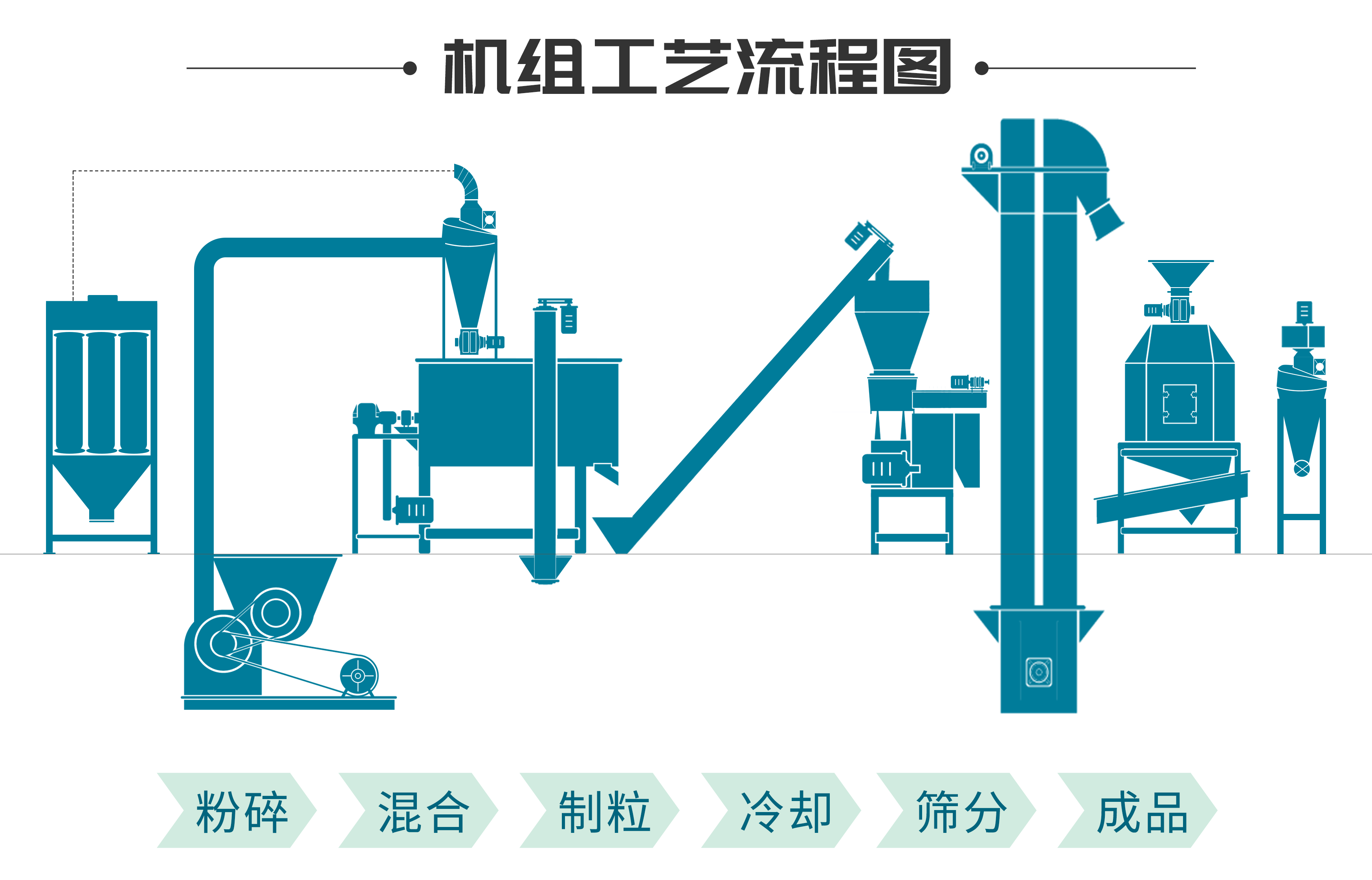 搭配的設備有:多功能粉碎機、單軸雙螺旋混合機、250型顆粒機、冷卻器及掛篩、提升輸送設備、液(yè)體添加係統(tǒng)、電控係(xì)統、空壓機等(děng)。