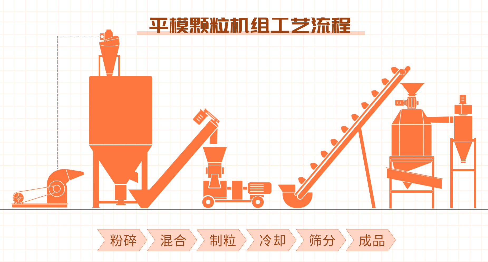 平模500顆粒飼料(liào)機組(zǔ)包含設備有(yǒu):多功能粉碎機、立式混合機、平模顆粒機、翻板冷卻器、振動掛篩、螺旋提升機、挖鬥輸送機以及(jí)除塵設備(bèi)、電控(kòng)設備等(děng)附屬(shǔ)設備。