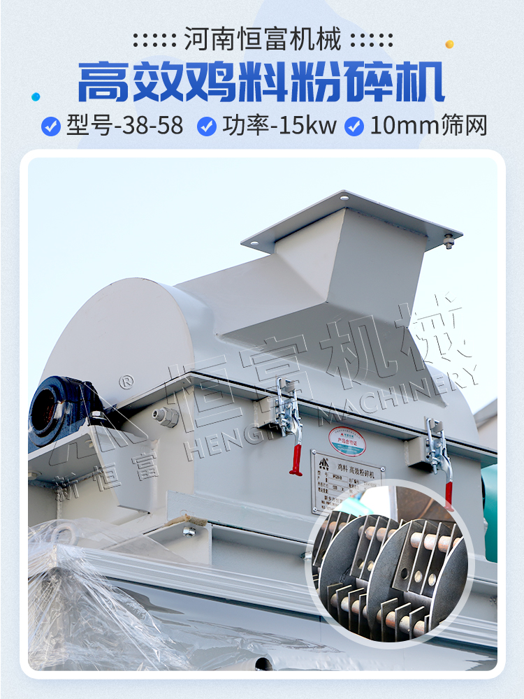 寬轉子,短錘片,低轉速,打出來顆粒狀物料多,粉料少,更適合雞、鴨等禽類飼料的粉碎(suì)。