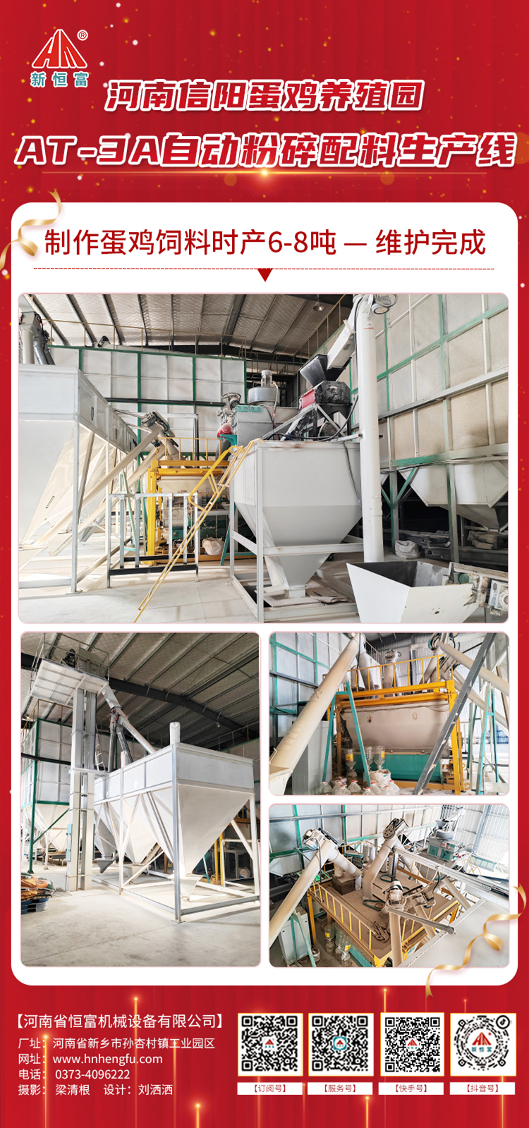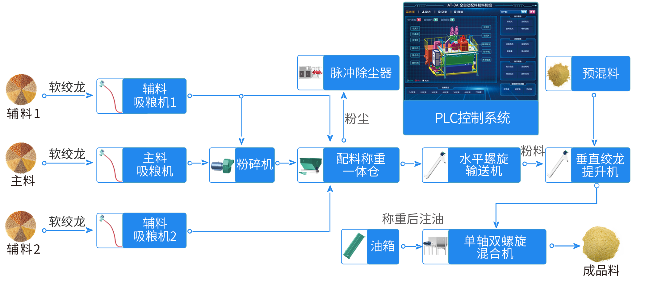 該生產線主要(yào)是做蛋雞(jī)粉狀飼料(liào),前端配備有高效飼料粉碎機用於粉(fěn)碎玉米原料,中間搭配多個待混倉(cāng),用於儲(chǔ)存預混料、石粉、麩皮、豆粕,後端搭配一套AT-3A全自動粉碎(suì)配料機組,可對物料進行集(jí)中稱重、配(pèi)料、注油、混合,混合後的飼料成品直接輸送至成品飼料倉進(jìn)行存放。該設備適用於各種飼料廠、養殖場使用,可加工濃縮飼料、全價粉狀飼料等。