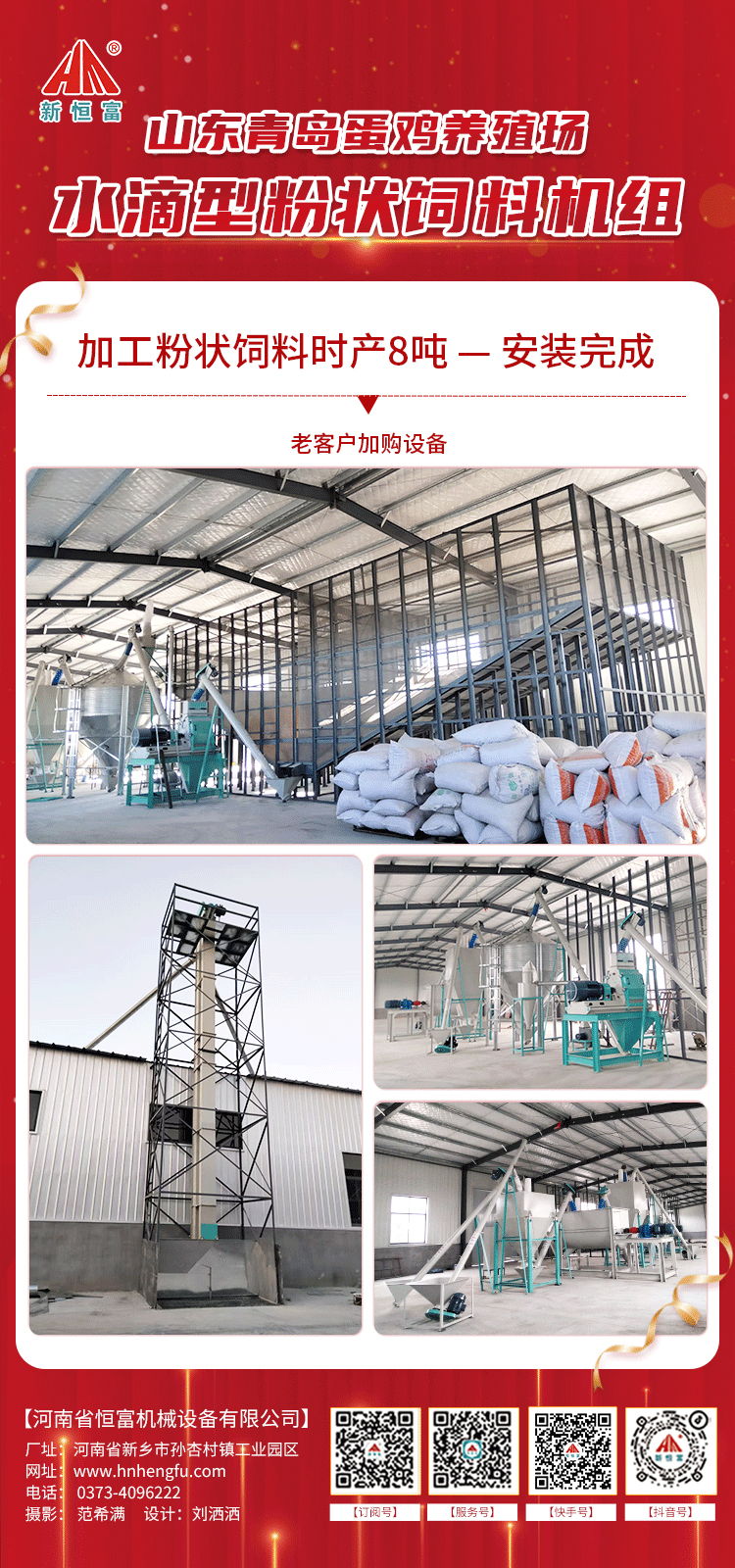山東青島蛋雞養(yǎng)殖場,時產8噸粉狀飼料加(jiā)工機組安裝完成。