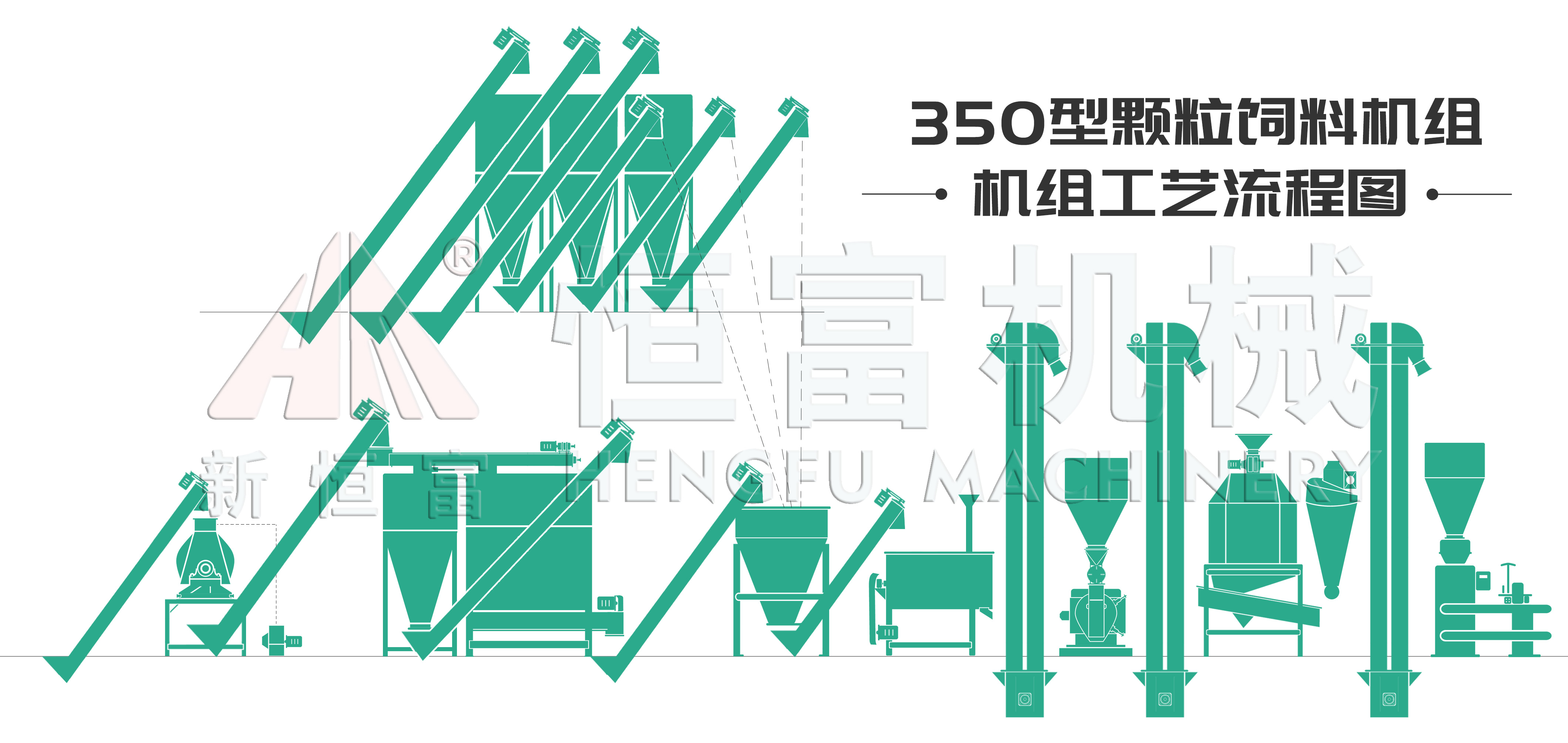 該機組(zǔ)主要是做兔(tù)飼料,前(qián)端搭配有(yǒu)水滴型飼料粉碎機、12m³苜蓿粉倉、3個2m³料(liào)倉以及1個(gè)2m³配料秤,中間搭配有臥式單軸雙螺帶飼料混合機、環模(mó)飼料顆粒機,後端搭配了逆流式(shì)飼料冷卻器、飼料振動掛篩以及自動定量飼料包裝機等。該機(jī)組先對玉米進行粉碎,然後將玉米粉、苜蓿粉等進(jìn)行稱重、配料,隨(suí)後進行混合、製粒,最後對壓(yā)製出來的成品顆粒飼料進行(háng)冷卻、篩分、包裝。本條生產線是(shì)一條完整的顆(kē)粒飼料加工機組,不僅(jǐn)可以做草粉顆粒飼料還可做精糧顆粒飼料。