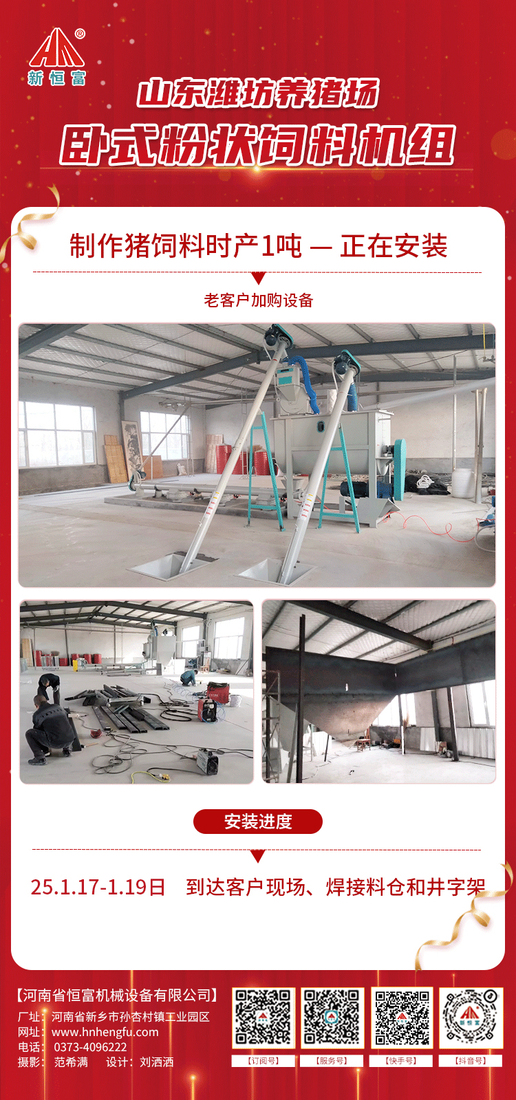 山東濰坊養豬場,時產1噸粉狀飼料加(jiā)工機組正在安裝(zhuāng)。