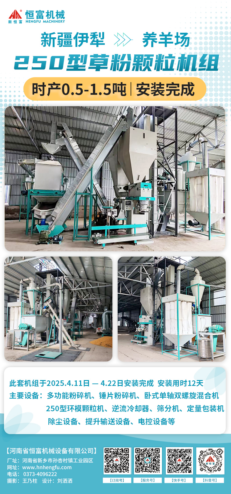 新疆伊犁(lí)養羊場,時產0.5-1.5噸250型草粉顆粒飼(sì)料機組安裝完成。