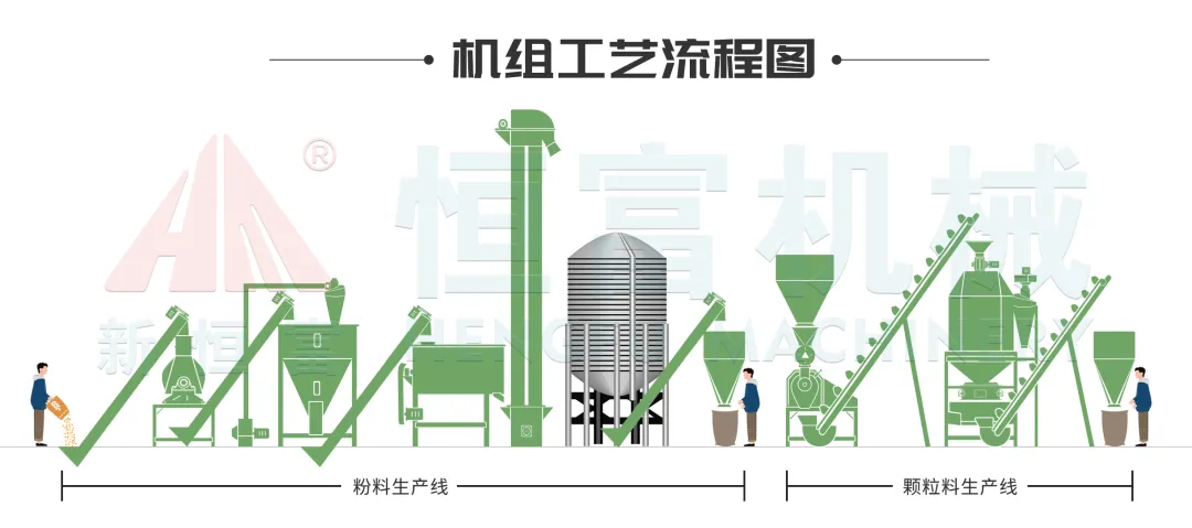 粉料(liào)+顆粒生產線:水滴式(shì)飼料粉碎(suì)機、緩衝倉、單軸雙螺旋飼料混合機、鍍鋅(xīn)料塔、環模(mó)顆粒機、翻板(bǎn)逆流冷卻器、破碎機以及各種輸送設備等。