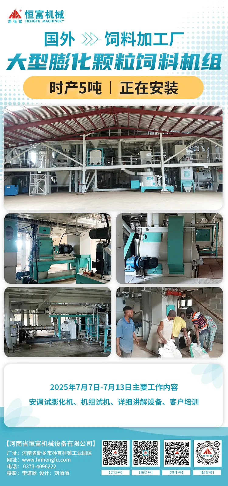 2025年(nián)7月7日至7月13日主要工作內容:調試噴油泵,膨化機,修鍋爐喂料器,安裝複位;翻譯到位(wèi),培訓鍋爐操作,調試打包機,改(gǎi)線路,打黃油,試機教學工人自己操作粉原料(liào),學習打包等。