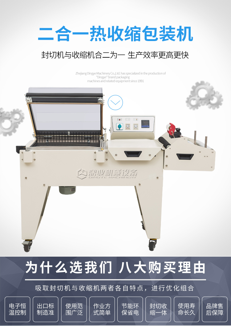 FM5540二合(hé)一熱收縮包裝機以POF、PP、PVC收縮膜為(wéi)材料(liào),集封(fēng)口和收縮為一體,隻須一個(gè)人工作便可完成封口(kǒu)和收縮作(zuò)業,且降(jiàng)低了功(gōng)率的消耗(hào),廣泛用於飲料、禮品、五金、化妝品、玩具及塑膠等外包裝。